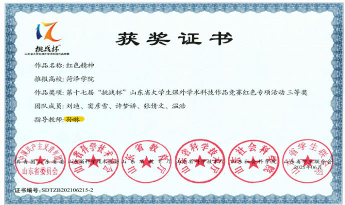 第十七届“挑战杯”山东省大学生课外学术科技作品竞赛红色专项 活动三等奖指导教师(2021):孙琳