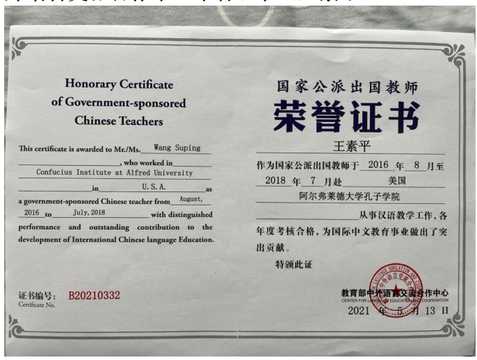 教育部中外语言交流合作中心荣誉证书:王素平