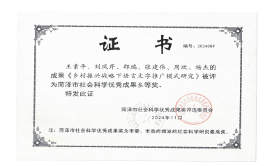 菏泽市社会科学优秀成果奖三等奖(2024):“乡村振兴战略下语言文字推广模式研究”