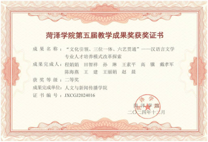 菏泽学院第五届教学成果奖二等奖(2024):“文化引领、三位一体、六艺贯通”——汉语言文学专业人才培养模式改革探索