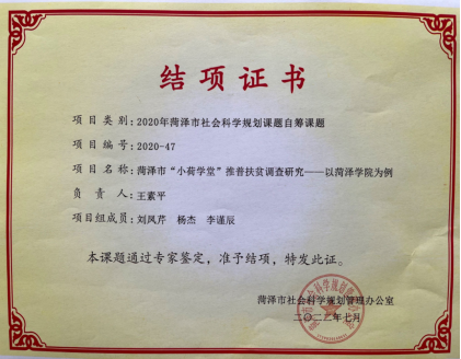 菏泽市社科联项目(2020-2022)“菏泽市‘小荷学堂’推普扶贫调查研究”