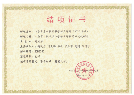 山东省基础教育教学研究课题(2020-2021):“三全育人视域下中学语文课程思政建设研究”